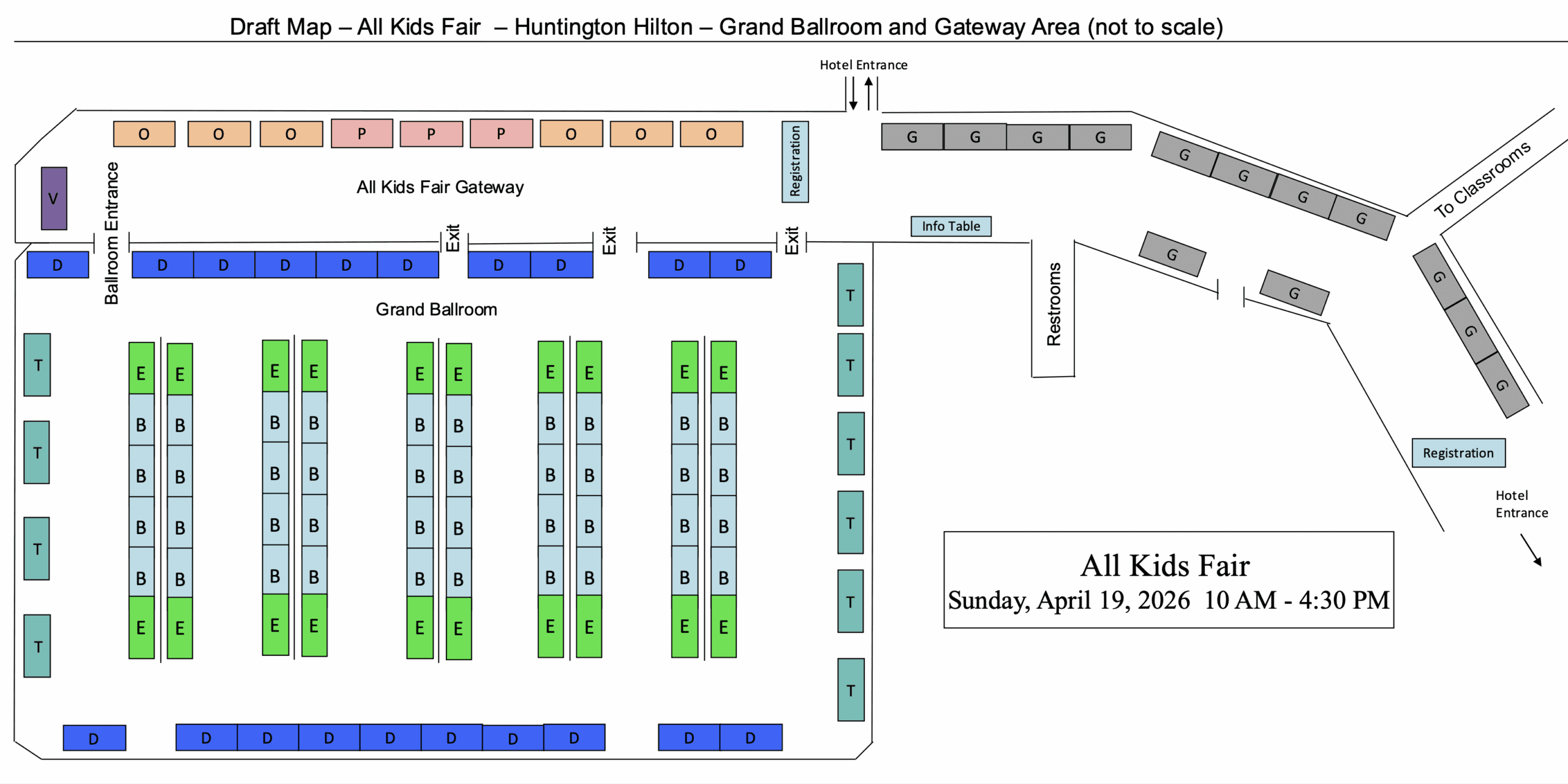 This is the Draft Map for the Sunday, April 19, 2026 All Kids Fair. Please use this as a guide in helping you select the type of booth that would best suit your needs.
